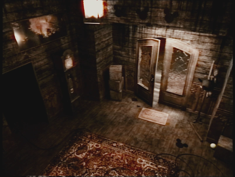 The room is an entrance to a wooden cabin, like most rooms, it has a wooden floor. There are windows on the double doors, the outside is briefly visible, as you can make out a porch, a dirt path and some grass. There are three Mickey Mouse head symbols above the entrance door, one of them is on the floor, meaning that there were four. There's a stack of boxes and a coat hanger besides the entrance door, alongside a welcome mat. On the left side is a door with a grandfather clock next to it.