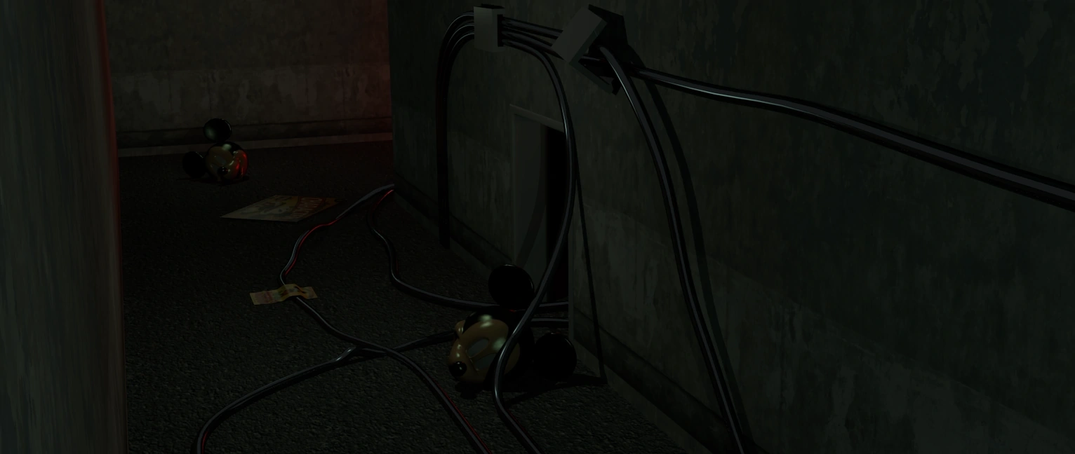 CAM 9 is a corridor with lots of wires on the floor and wall. In the distance and next to the doorway, you can see the heads of Mickey Mouse, and not far from them are 2 Disney posters.