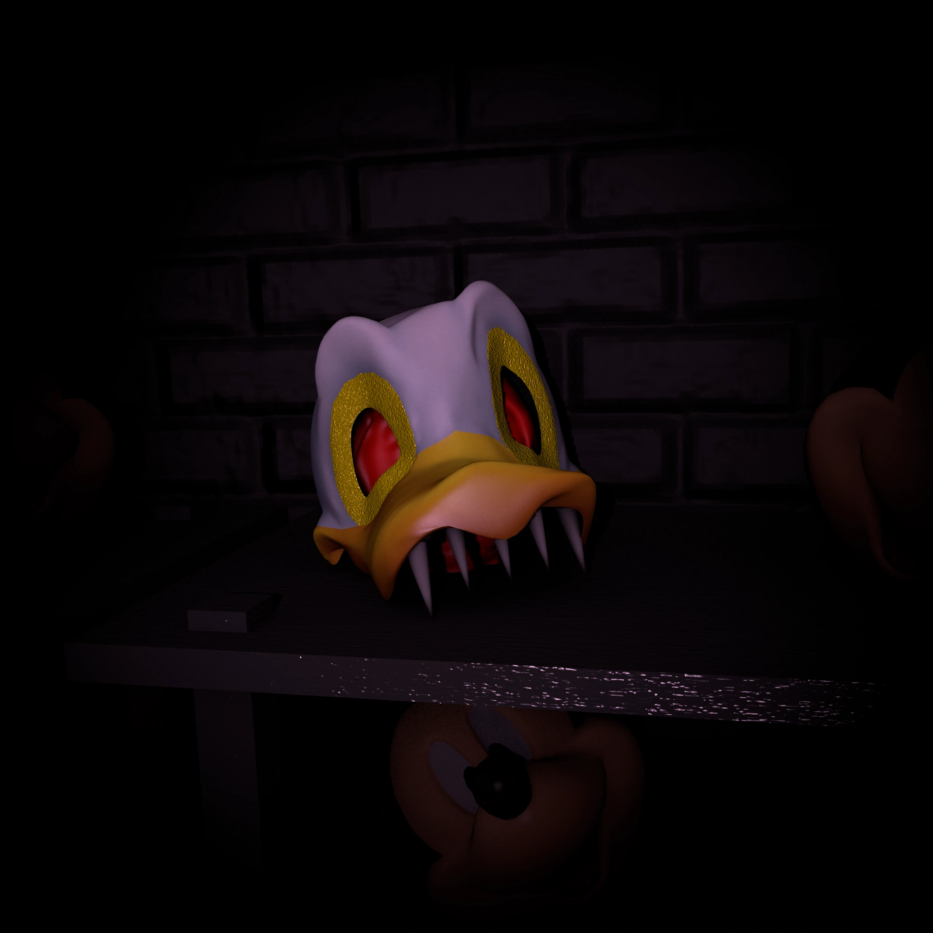 Nightmare Daisy is a malformed Daisy Duck head who has sharp metallic teeth on her twisted beak and lacks her jaw. Similar to Nightmare Disembodied, Nightmare Daisy has thick viscous yellow lining on her eye sockets and inside her head is a deformed fleshy mass.