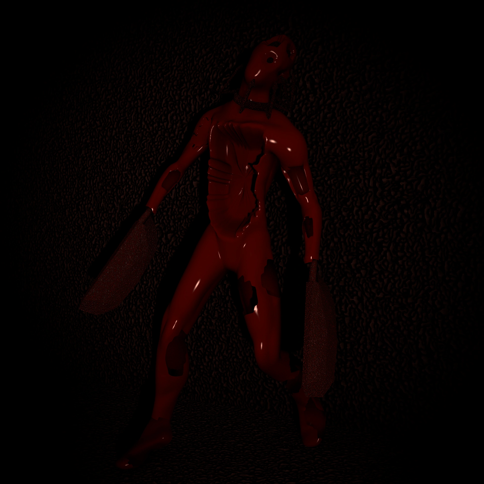 His torso has a massive dent that reaches from his shoulders to the top of his pelvis. His arms appear to suffer somewhat similar withering, except they reveal his body to have a hollow interior. His hands are torn at the wrist, and are replaced with flesh poles that are connected to massive flesh cleavers that glisten similarly to his neck tendrils.